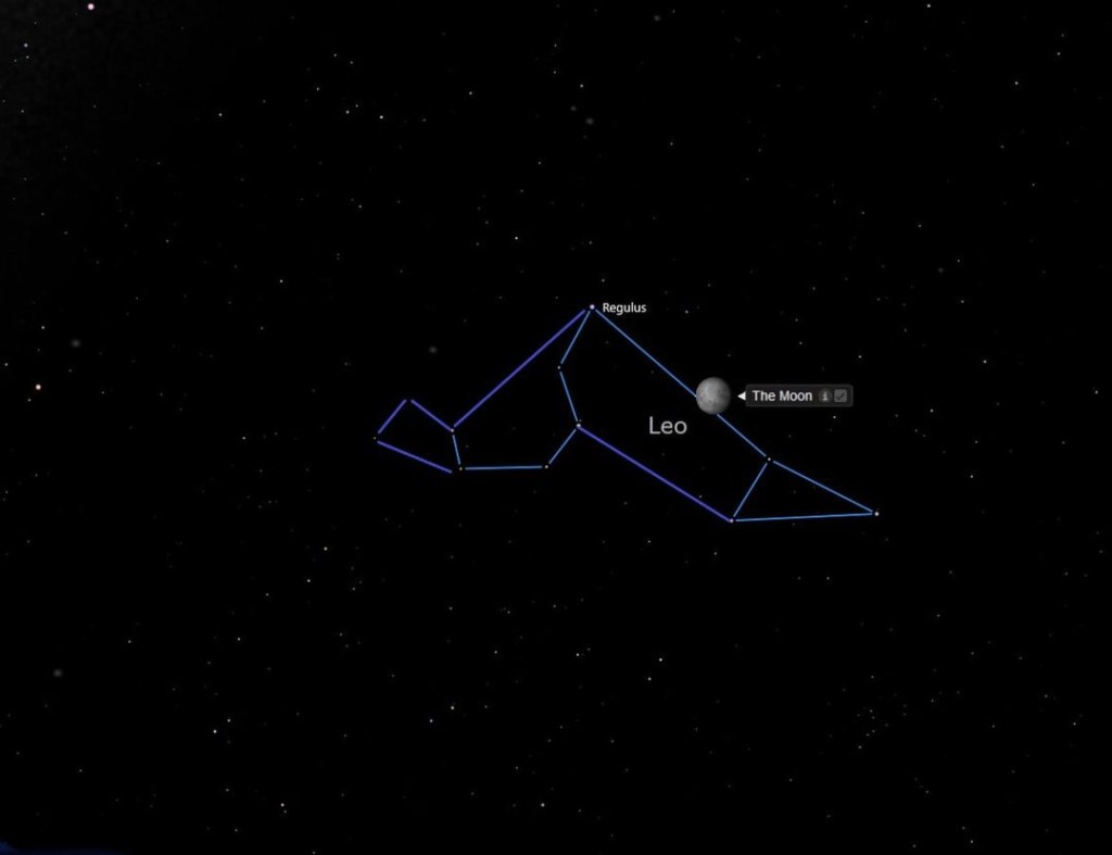 The moon drifts against the starry background through the sky to return almost a month later to where it started its journey. Since the moon is easily recognised, it is convenient starting point to identify nearby celestial objects. I will post guides to various constellations, using the moon as reference.I am kicking off the ‘Get to know the sky’ series with the constellation ‘Leo’ or Lion. This is one of a handful of constellations that actually resembles the object it is supposed to depict. I added some extra lines to the Starry night outline to show a lion laying down with his head upright. Regulus, a double star, is the brightest star in the constellation at magnitude 1.34 (see an earlier post on magnitudes).The map represents the sky over Pretoria tonight at 20:00. The orientation of the constellation will differ if you look at a different time or from another location. The lion will be more upright for observers in the northern hemisphere.